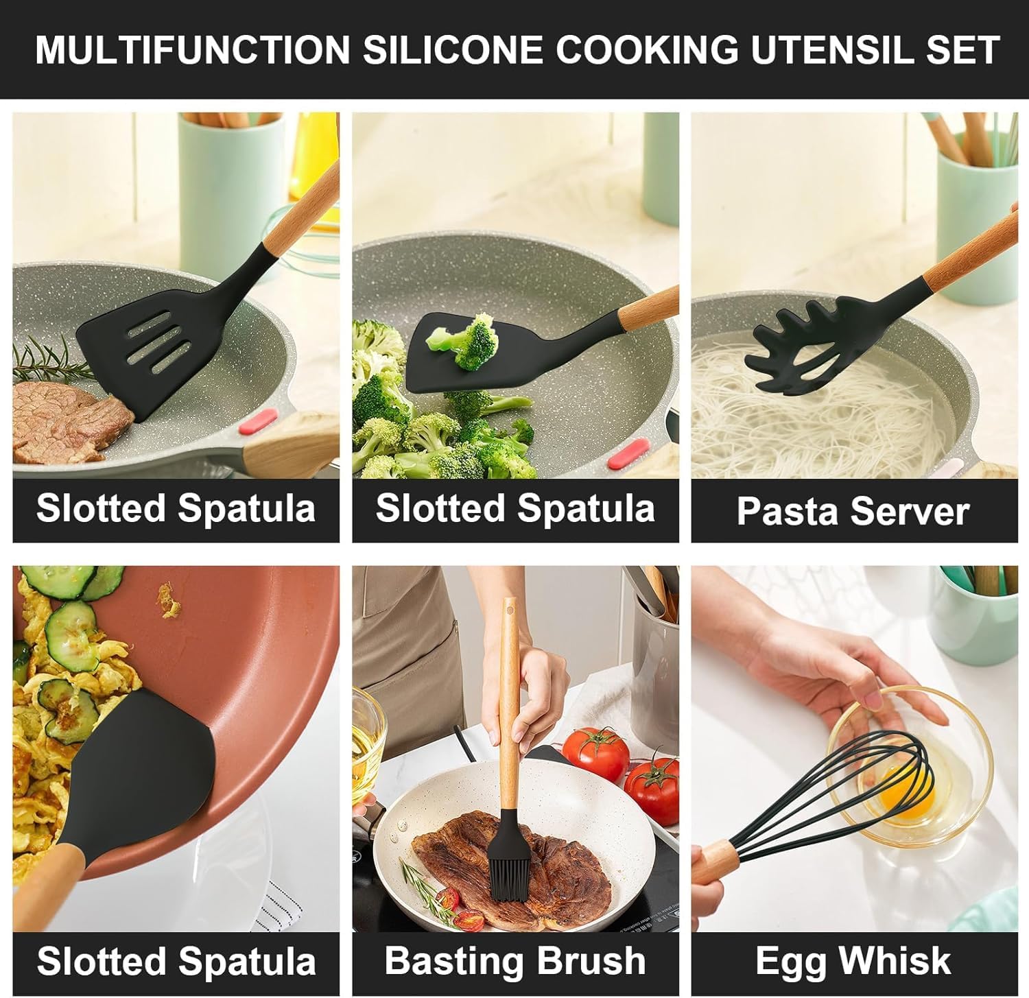This 12-piece silicone and wood utensil set solves it all. Heat-resistant, non-stick safe, and durable, itβs perfect for flipping, stirring, serving, and more. With a matching countertop holder, lightweight handles, and easy cleanup, everything you need is organized, stylish, and within reachβmaking cooking effortless and enjoyable.
